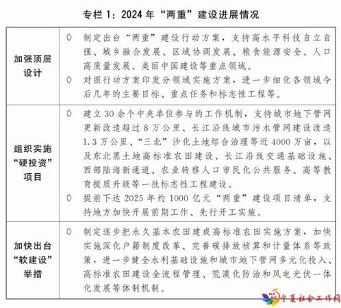 二是发行超长期特别国债支持“两重”建设取得积极进展。着眼于系统解决强国建设、民族复兴进程中一些重大项目建设的资金问题,从2024年起发行超长期特别国债支持国家重大战略和重点领域安全能力建设。坚持自上而下、软硬结合,建立实施项目储备、集中联审、专款专用、强化监督等全链条推进保障机制。“硬投资”方面,严格做好项目筛选,2024年安排7000亿元超长期特别国债支持1465个重大项目建设,项目基本全部开工、全年完成投资超过1.2万亿元。“软建设”方面,坚持项目建设和配套改革相结合,扎实推进规划编制、政策制定和体制机制改革创新,不断完善投入机制、提高投入效率。规范项目全过程管理方面,出台“两重”建设有关管理办法,督促项目加快开工建设,严格资金监管,加强监测调度和现场监督检查,确保建成优质工程、精品工程、放心工程。