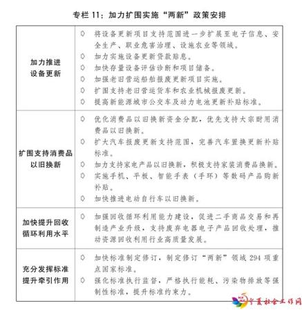 四是加力扩围实施“两新”政策。安排超长期特别国债5000亿元支持大规模设备更新和消费品以旧换新,统筹投资、财政、金融等综合性政策,深入推进设备更新、消费品以旧换新、回收循环利用、标准提升四大行动。进一步加大重点领域设备更新项目支持力度,加力实施设备更新贷款贴息,加快存量设备评估诊断和项目储备。进一步支持消费品以旧换新,扩大汽车报废更新支持范围,完善汽车置换更新补贴标准,实施手机、平板等数码产品购新补贴,积极支持家装消费品换新,简化补贴申领和支付流程,完善资金监管机制,严厉打击价格欺诈和违规骗补套补行为。
