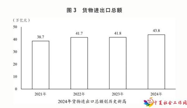 (六)加快建设更高水平开放型经济新体制,高水平对外开放取得积极成效。全年货物进出口总额43.8万亿元,服务进出口总额7.5万亿元,外商直接投资1162亿美元,境外直接投资1438亿美元。年末外汇储备规模达32024亿美元。