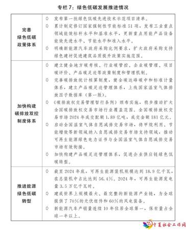 三是加快推动绿色低碳发展。持续构建碳排放双控制度体系,制定出台碳达峰碳中和综合评价考核办法,建立健全碳排放统计核算制度、碳排放预算管理制度、产品碳足迹管理体系、产品碳标识认证制度,丰富完善国家温室气体排放因子数据库。推动全国碳排放权交易市场、温室气体自愿减排交易市场、绿色电力证书市场建设。发布第二批绿色低碳先进技术示范项目清单,扎实开展第二批国家碳达峰试点,出台零碳园区建设方案。延长碳减排支持工具实施年限至2027年,有序推进碳金融产品和衍生工具创新,发展绿色保险。有力有效管控高耗能高排放项目,加快推动重点领域节能降碳改造和用能设备更新,加强重点用能单位节能管理,完善节能降碳标准体系,深入实施能效标识制度。健全资源环境要素市场化配置体系。营造绿色低碳产业健康发展生态,培育绿色建筑、绿色能源、绿色交通等新增长点。加强煤炭绿色智能开发、清洁高效利用。统筹新能源开发与消纳,有力有序推进集中式和分布式新能源健康发展,加快“沙戈荒”新能源基地建设,有序开发建设海上风电基地,统筹就地消纳和外送通道建设。大力实施可再生能源替代行动。推进煤电低碳化改造示范。进一步规范新型储能并网管理,持续完善调度机制。实施全面节约战略,持续推动“能水粮地矿材”一体化节约,深入实施国家节水行动。大力发展循环经济,加强废弃物循环利用,推广再生材料使用。