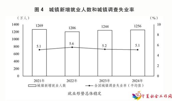 一是稳就业促增收取得积极成效。出台实施就业优先战略促进高质量充分就业的意见。延续实施失业保险援企稳岗政策,优化整合吸纳就业补贴和扩岗补助。强化高校毕业生、脱贫人口、农民工以及就业困难人员等就业帮扶。实施高校毕业生等青年就业服务攻坚行动、先进制造业促就业行动和百万就业见习岗位募集计划,构建高校毕业生高质量就业服务体系。加大力度支持公共实训基地建设,持续做好重点人群技能培训。做好退役军人就业服务保障,提高优抚补助标准。城镇新增就业1256万人,城镇调查失业率平均为5.1%。全国居民人均可支配收入实际增长5.1%。城乡居民人均可支配收入比为2.34,城乡居民收入相对差距继续缩小。指导地方上调最低工资标准。向困难群众发放一次性生活补助,惠及1100多万人。