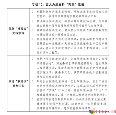 三是加力推进“两重”建设。进一步完善自上而下的工作机制,加强“两重”建设项目储备,更好统筹“硬投资”与“软建设”。安排超长期特别国债8000亿元支持“两重”建设,进一步优化具体投向并提高项目支持比例,重点支持基础研究能力提升、未来产业发展、东北等重点地区高标准农田建设、大中型灌区新建改造及大中型引调水和大中型水库建设、长江经济带生态环境保护和绿色发展、农业转移人口市民化公共服务体系建设、高等教育提质升级、城市地下管网管廊建设改造等方面任务,强化超长期贷款等配套融资,高质量推进“硬投资”项目谋划实施。加大力度推动“软建设”政策落地见效。