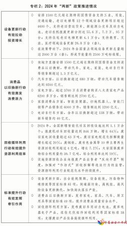 三是大规模设备更新和消费品以旧换新政策落地见效。印发“两新”行动方案,出台工业、建筑市政、交通、农业、教育、文旅、医疗等七大领域设备更新实施方案和消费品以旧换新、回收循环利用、标准提升引领行动方案。安排3000亿元超长期特别国债加力支持“两新”工作。2024年,“两新”政策带动全国设备工器具购置投资增长15.7%,高于固定资产投资(不含农户)增速12.5个百分点;限额以上单位家用电器和音像器材类、家具类商品零售额分别增长12.3%、3.6%,带动大宗耐用消费品销售额超过1.3万亿元;消费品以旧换新活动中,新能源汽车销量占比超过60%,一级能效家电销售额占比超过90%。