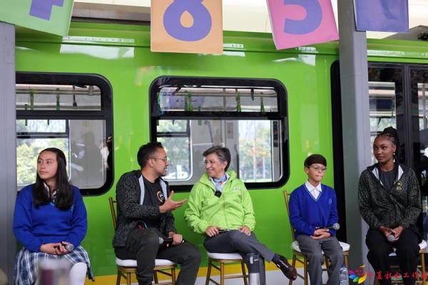 2023年8月10日,哥伦比亚波哥大市长克劳迪娅·洛佩斯(中)在波哥大地铁的模型车厢旁跟参加活动的师生交流。按照计划,由中企承建和运营的波哥大地铁一号线将在2028年正式投入运营。新华社记者 周盛平 摄