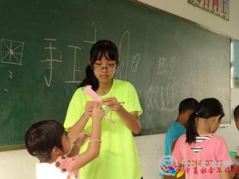 社工中国网消息:2014年7月13日,岭南师范学院凝夏三下乡实践队正式授课已经两天了。今天,该队队员开展的手工活动课让小朋友们学会了如何制作千纸鹤,纸制衣服等,这不但提高了他们的动手制作能力,而且丰富了他们的课堂时间。此外,新颖的电脑课不但让小学生们学会了电脑的使用手法,而且让他们懂得如何利用网络获取资源,增强了视野。生动有趣的地理大课堂使得同学们反应热烈,表现积极,对教授的内容十分感兴趣,特别是对台风,地震泥石流等相关自然灾害方面的知识有一定的了解,提高了安全意识,以后能够自如地应付自然灾害。绘画课教小学生们画Q版画像,当他们拿到小老师画的画十分开心,并且也争着要学画画,看着他们一笔一画勾勒出心中的美好世界,我们体会到了孩子们纯真与快乐。舞蹈课上,虽然舞蹈的某些动作对于年级尚小的人还有点难,但是他们都很努力的学,也很认真地问了小老师怎么摆动作,他们的学习热情无疑是对我们教学的最大鼓励和肯定。