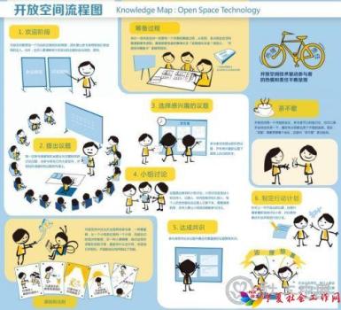 “开放空间”是由参会者自行讨论的一种动态的会议模式。在会议期间,每个参与者在主题框架下提出自己关心的问题或自己想要解决的问题或需求,并在不同参与者之间形成关注并能够致力于解决同一个问题或需求的小组,在既定的规则下开始小组讨论工作。应用民主参与的方法选出大部分参与者集中关心的话题组建实施小组并制定行动计划。